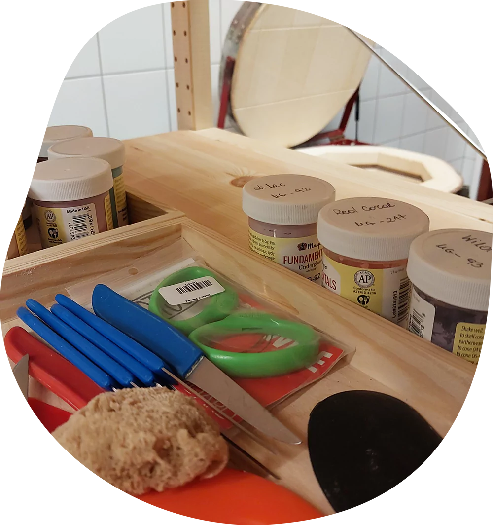 W pracowni znajdziecie wszelkie niezbędne materiały – kilka rodzajów mas ceramicznych (biała, szara, beżowa w kropeczki, czarna), szkliwa, angoby (specjalne farby do ceramiki), pigmenty i narzędzia.